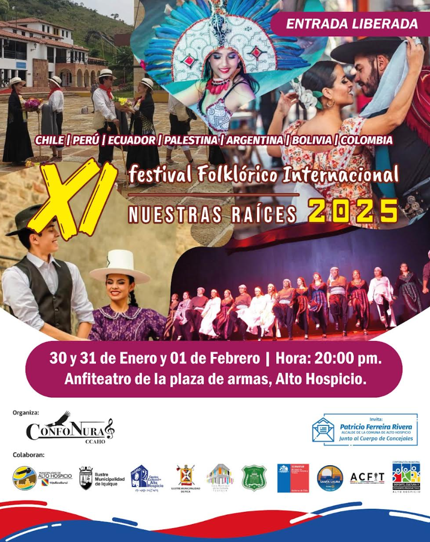 La Municipalidad de Alto Hospicio, junto al Conjunto de Danzas Folclóricas Nuestras Raíces (CONFONURA), recibió a representantes de Argentina, Bolivia, Colombia, Palestina, Perú y Chile para la undécima edición del Festival Folclórico Internacional “Nuestras Raíces”. El evento se celebrará en el Anfiteatro de la Plaza de Armas de Alto Hospicio del 30 de enero al 1 de febrero.