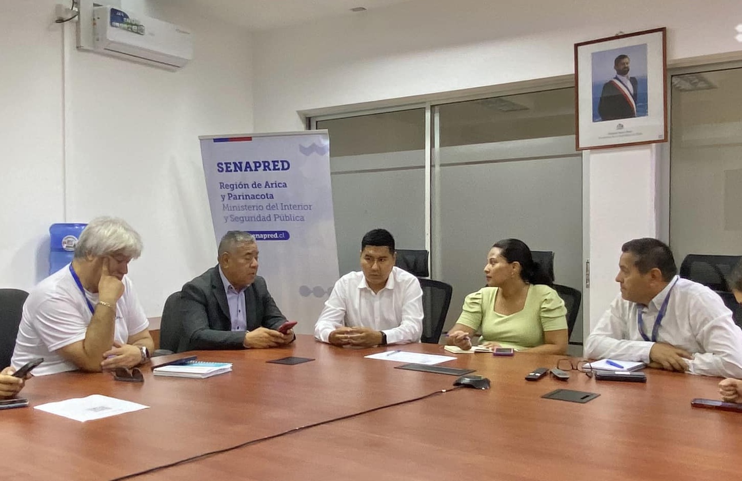 La delegada presidencial de Arica, Camila Rivera; el alcalde de Arica, Orlando Vargas; y el gobernador Diego Paco, se reunieron en las dependencias de Senapred para realizar una evaluación tras las precipitaciones en la región.