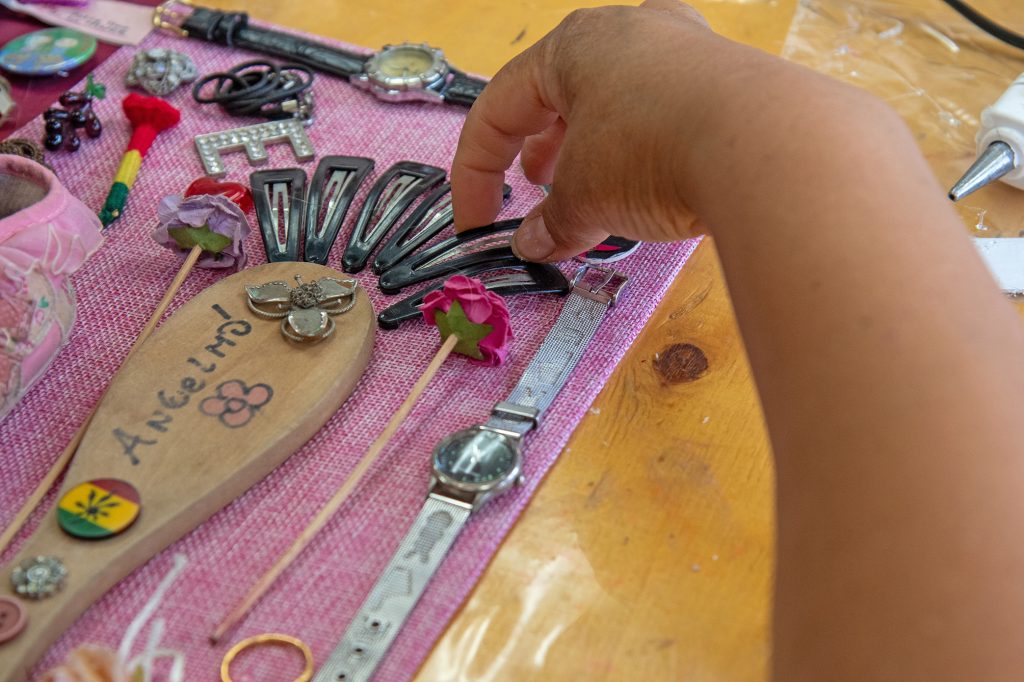 A través de la confianza y la conexión, el laboratorio invita a reflexionar sobre el significado de los objetos personales y su potencial para resignificarse en una obra de arte. Fotografías antiguas, botones, mostacillas, retazos de tela, conchitas de mar, recuerdos de bautizos o casamientos, entradas a eventos y pequeños envases en desuso se transforman en puertas abiertas a la memoria y la imaginación, convirtiendo los recuerdos en arte tangible.