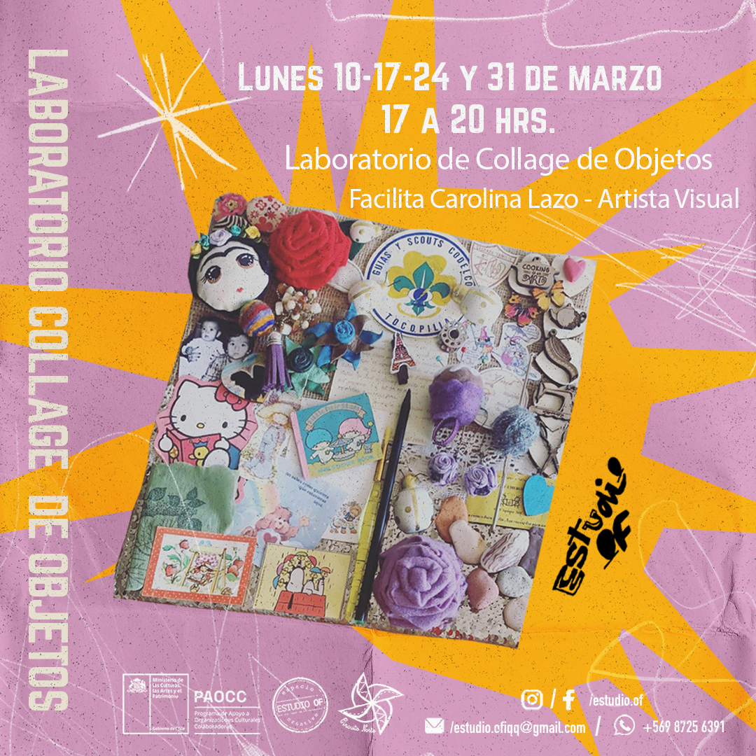 Gracias al financiamiento del Ministerio de las Culturas, las Artes y el Patrimonio, a través de su Programa de Apoyo a Organizaciones Culturales Colaboradoras, se desarrolló el primer laboratorio titulado “Collage de Objetos”, realizado todos los lunes de marzo, de 17:00 a 20:00 horas en las dependencias de Estudio OF.