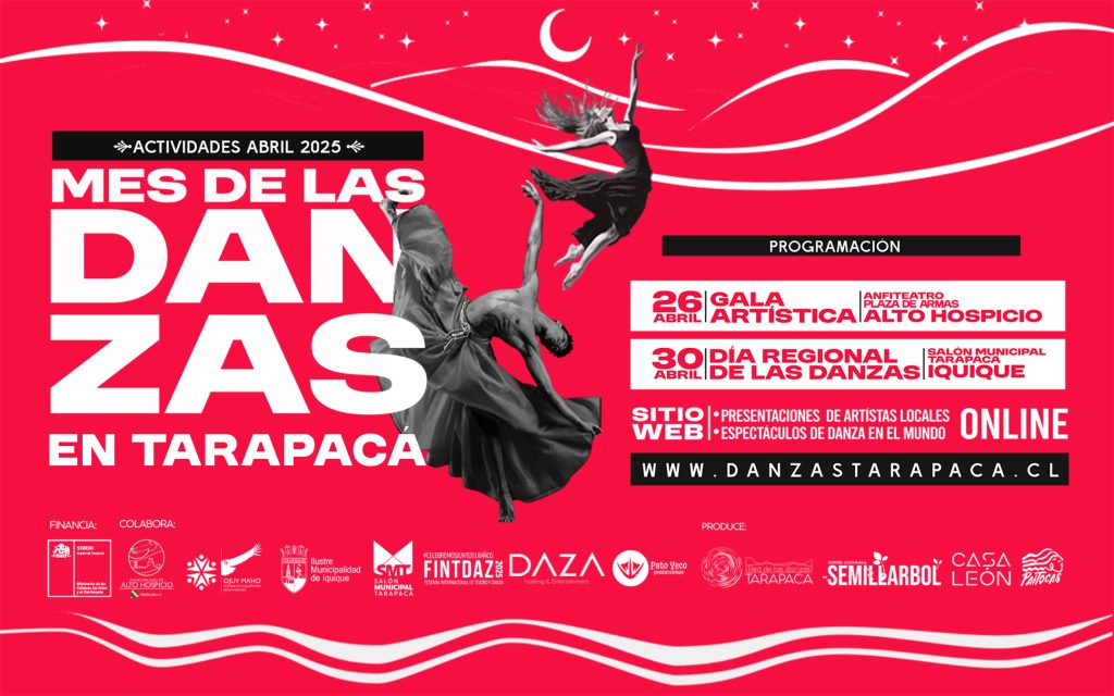 El segundo evento es el “Día Regional de las Danzas” el que se realizará el miércoles 30 de abril de 19:00 a 21:30 en el Salón Municipal Tarapacá y estará enfocado en la presentación del Plan de Fortalecimiento del Sector de las Danzas, impulsado por la Red de las Danzas Tarapacá, organización local que convoca a agentes, espacios culturales, academias y agrupaciones de diversos orígenes y expresiones culturales activas en la región.