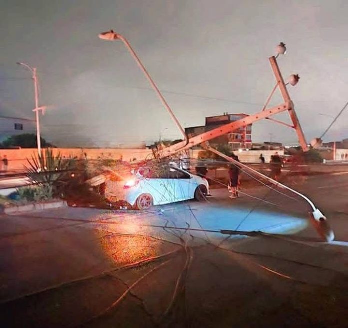 Un accidente de tránsito ocurrido en la madrugada de este viernes causó la caída de tres postes de la red eléctrica y la destrucción de un transformador en el sector de La Pampa, en Alto Hospicio. El choque, que tuvo lugar en la Avenida Las Américas, entre Finlandia y Polonia, provocó un corte de suministro eléctrico en la zona.