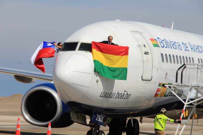 La mañana del sábado 26 de abril la aerolínea estatal Boliviana de Aviación (BoA) inauguró vuelos a la ciudad de Iquique y Santiago de Chile con miras a fortalecer la integración comercial y turística entre ambos países.