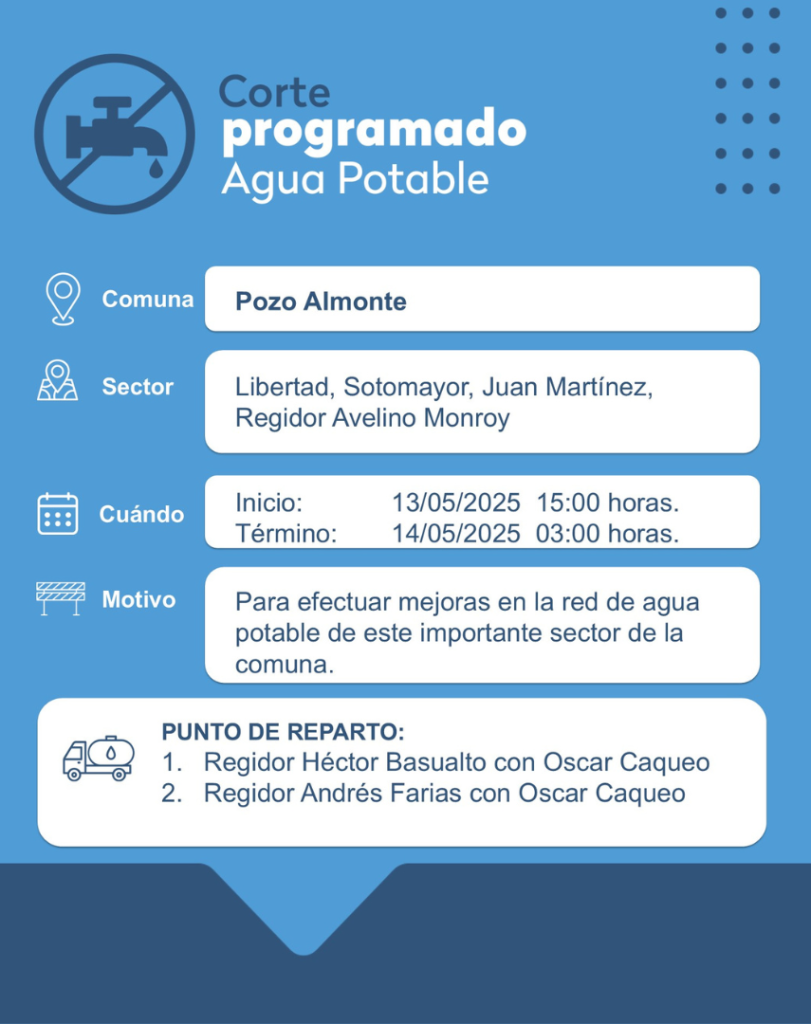 La empresa Aguas del Altiplano realizará este martes 13 de mayo suspensiones programadas del suministro en las comunas de Iquique y Pozo Almonte, para efectuar mejoras en la red de agua potable y en la red contra incendios.