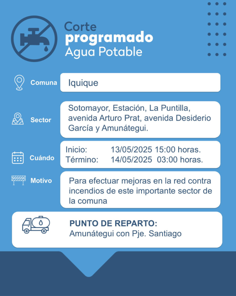 El corte abarcará el cuadrante conformado por las calles Sotomayor, Estación, La Puntilla, avenida Arturo Prat, avenida Desiderio García y Amunategui afectando a cerca de 2.400 personas (593 clientes) en la comuna de Iquique.