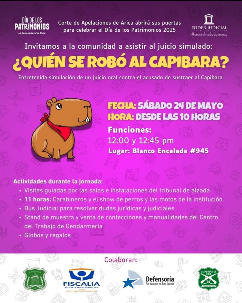 En tanto, la principal atracción será el juicio simulado, organizado por la Corte de Apelaciones y que contará con la colaboración de la Fiscalía Regional y la Defensoría Penal Pública de Arica, las cuales presentarán este juicio simulado “¿Quién se robó al Capibara?”.
