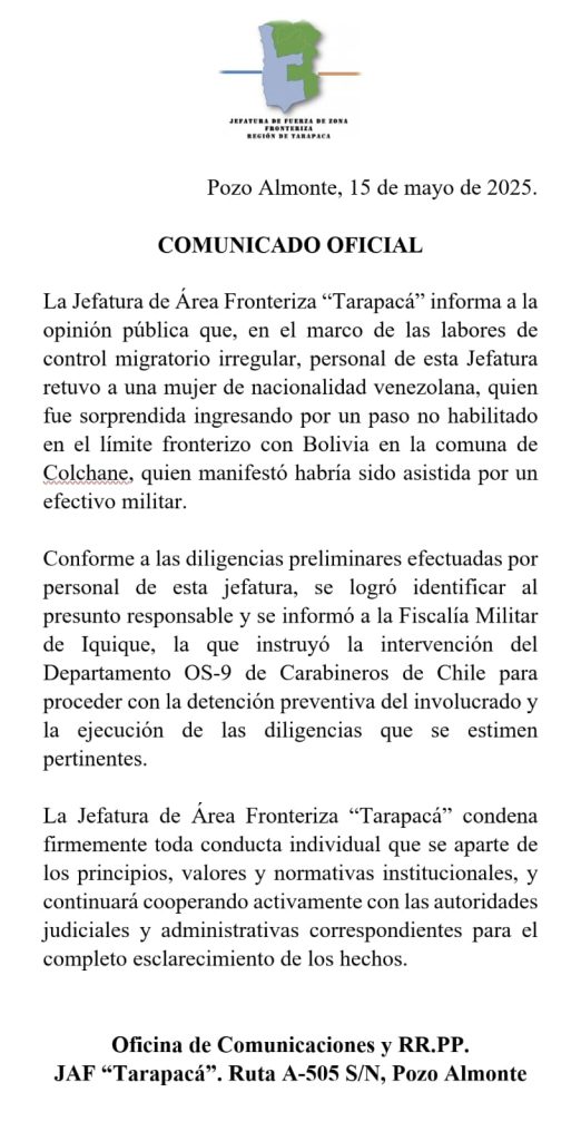 A través de un comunicado, la Jefatura de Área Fronteriza (JAF) Tarapacá del Ejército informó este jueves que uno de sus funcionarios fue detenido por Carabineros ante una denuncia por presuntamente facilitar el ingreso irregular de una ciudadana extranjera en la frontera de Colchane.