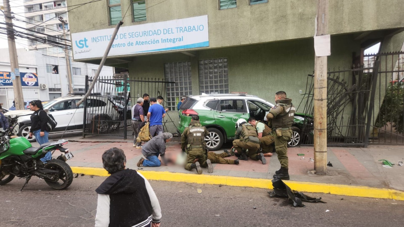 Tras el impacto, el vehículo de Carabineros quedó incrustado entre las rejas de la sucursal del Instituto de Seguridad del Trabajo. Además, los afectados fueron trasladados hasta el hospital regional de Iquique sin riesgo vital.