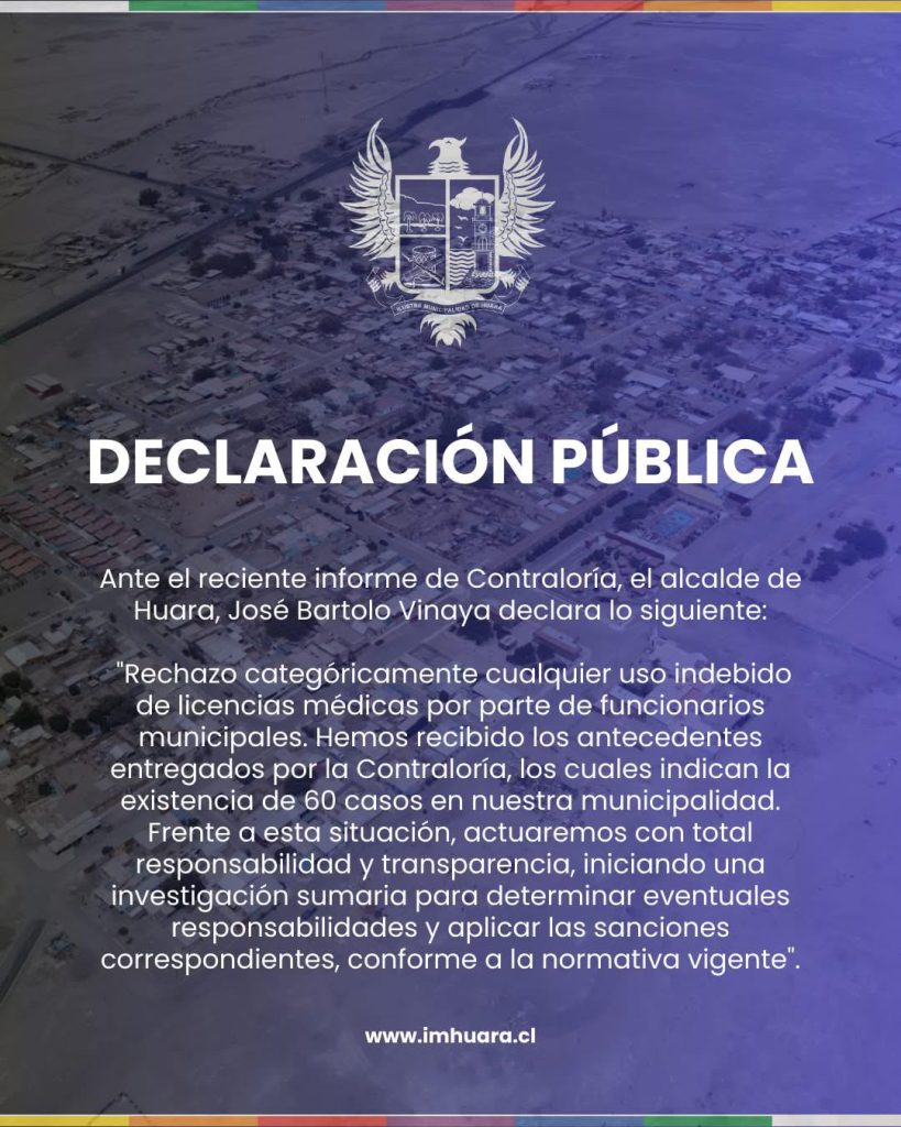 A raíz del informe de la Contraloría General de la República (CGR ) que reveló que más de 25 mil funcionarios públicos hicieron uso de licencias médicas mientras se encontraban fuera del país, la Municipalidad de Huara y Pozo Almonte anunciaron una serie de medidas disciplinarias contra los funcionarios involucrados en sus reparticiones.