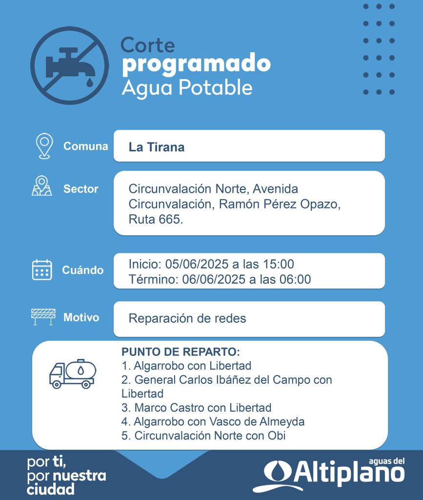El corte afectará a los sectores de Circunvalación Norte, Avenida Circunvalación, Ramón Pérez Opazo y Ruta 665. Durante este periodo, la empresa dispondrá de ocho puntos de distribución de agua potable alternativa, ubicados en: