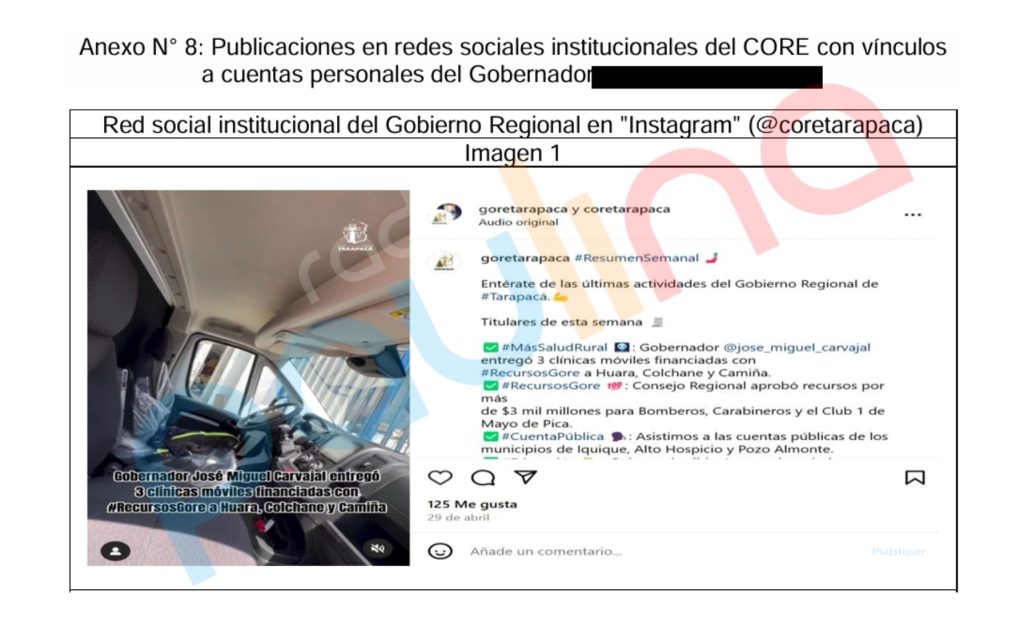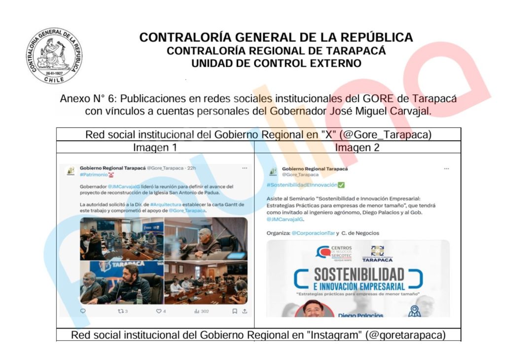 En el informe se agrega que el 15 de octubre 2024, la Contraloría Regional solicitó al GORE eliminar de sus redes sociales los vínculos con la cuenta personal del gobernador Carvajal, situación que se evidenció por el equipo de fiscalización que fue eliminada al día siguiente de dicha notificación.