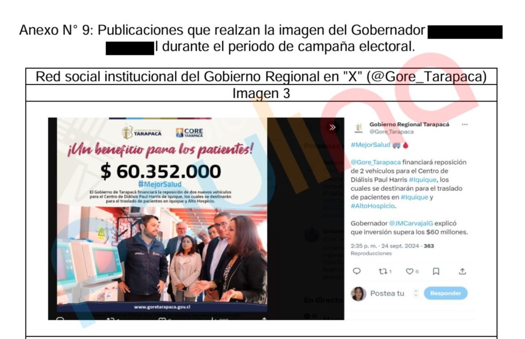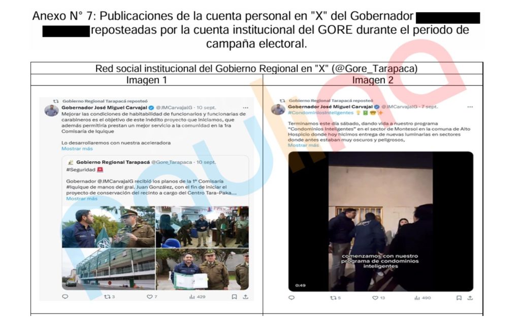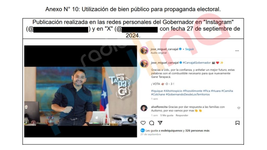 La entidad fiscalizadora advirtió que José Miguel Carvajal, en sus redes sociales personales de Instagram y “X”, siendo candidato a la reelección de gobernador, publicó un mensaje alusivo a su campaña adjuntando un vídeo en el cual se aprecia dirigiéndose a la comunidad desde la oficina del Gobierno Regional de Tarapacá, incumpliendo lo establecido en el dictamen N° E545210 de 2024.
