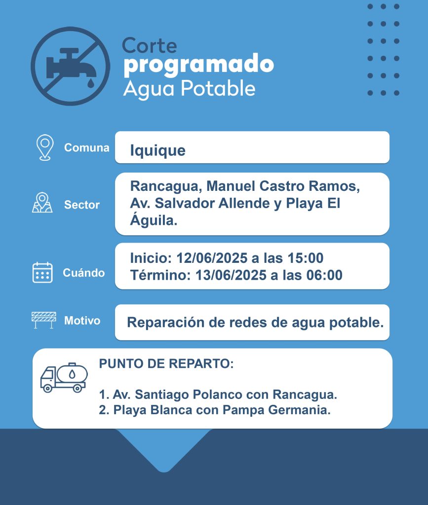 Ese mismo día y en mismo horario, se desarrollarán también obras de reparación de redes en Iquique, en el cuadrante de Rancagua, Manuel Castro Ramos, Avenida Salvador Allende y Playa El Águila, donde se dispondrán puntos de distribución de agua en Avenida Santiago Polanco con Rancagua y en Playa Blanca con Pampa Germania.
