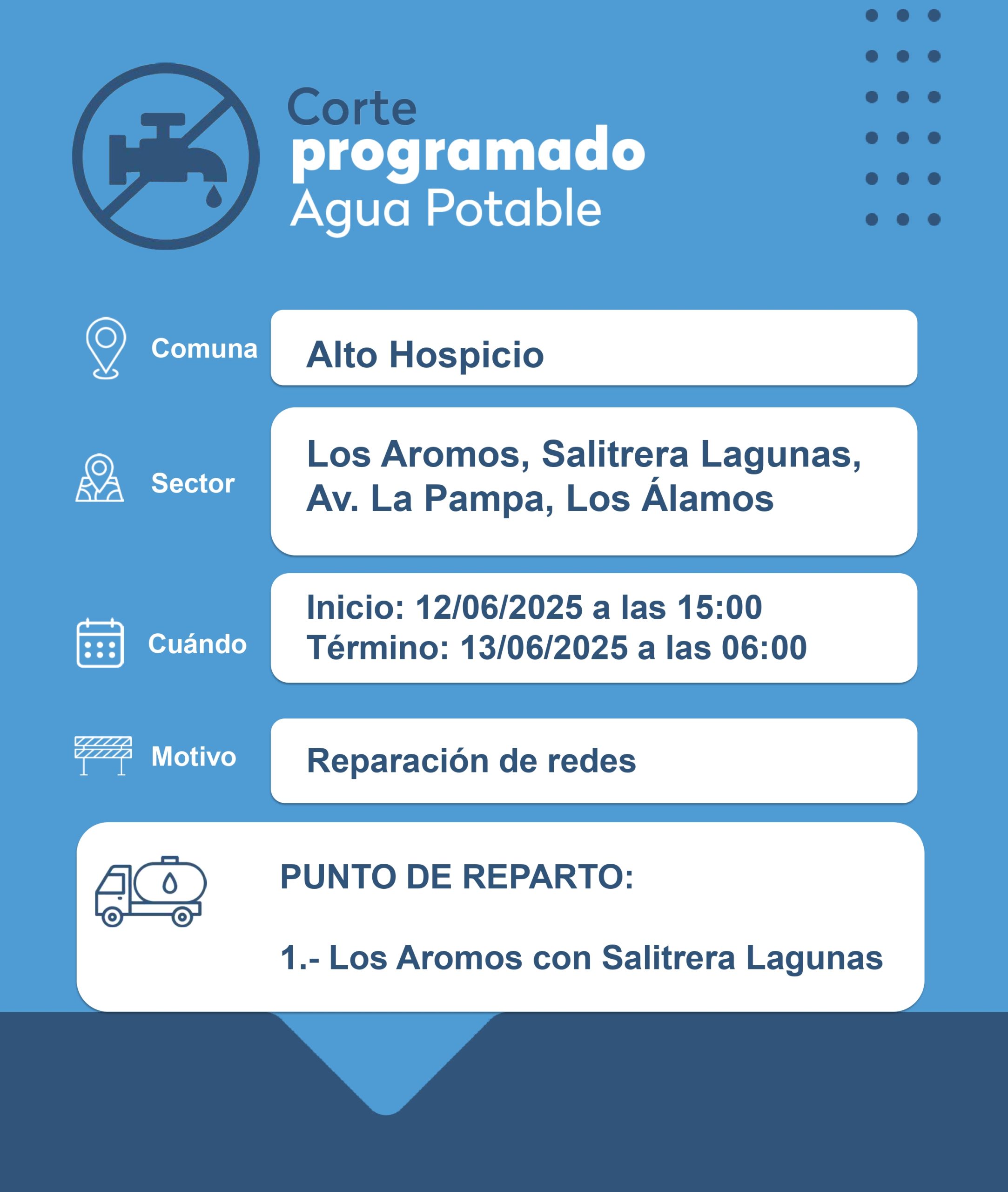 El segundo corte será el jueves 12 de junio en el cuadrante formado por las calles Los Aromos, Salitrera Lagunas, Avenida La Pampa y Los Álamos de la comuna de Alto Hospicio. El suministro se interrumpirá entre las 15:00 horas y las 06:00 del viernes 13 de junio, y habrá un punto de reparto en Los Aromos con Salitrera Lagunas.