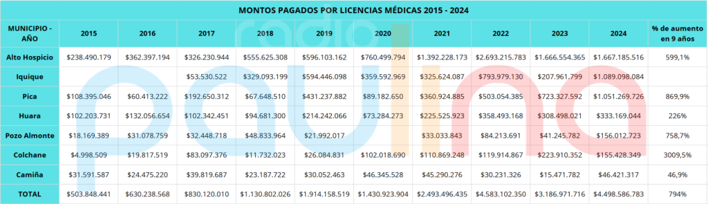 Más abajo están Huara con $333 millones, Pozo Almonte con $156 millones, Colchane con $155 millones y la Municipalidad de Camiña con $46 millones en gastos para licencias médicas durante 2024.