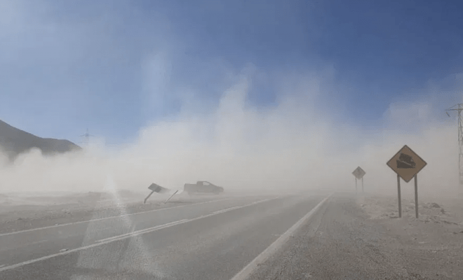 Se trata de un fenómeno que afectará al sector de la cordillera de Tarapacá, Antofagasta y Atacama con una intensidad estimada de vientos de hasta 80 a 100 kilómetros por hora desde la tarde del viernes 27 de junio hasta la mañana del domingo 29 de junio.