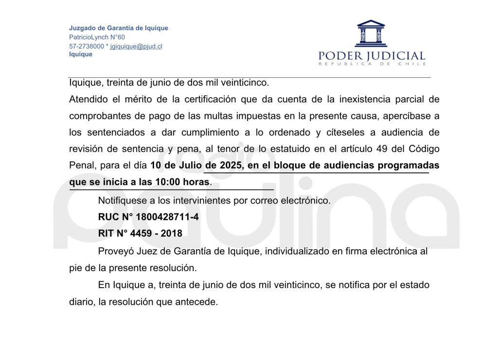 El Juzgado de Garantía de Iquique ordenó que once sentenciados por el Caso Luminarias LED comparezcan el 10 de julio para revisar el cumplimiento de las multas que les fueron impuestas, luego de detectar comprobantes de pago faltantes en el expediente judicial .