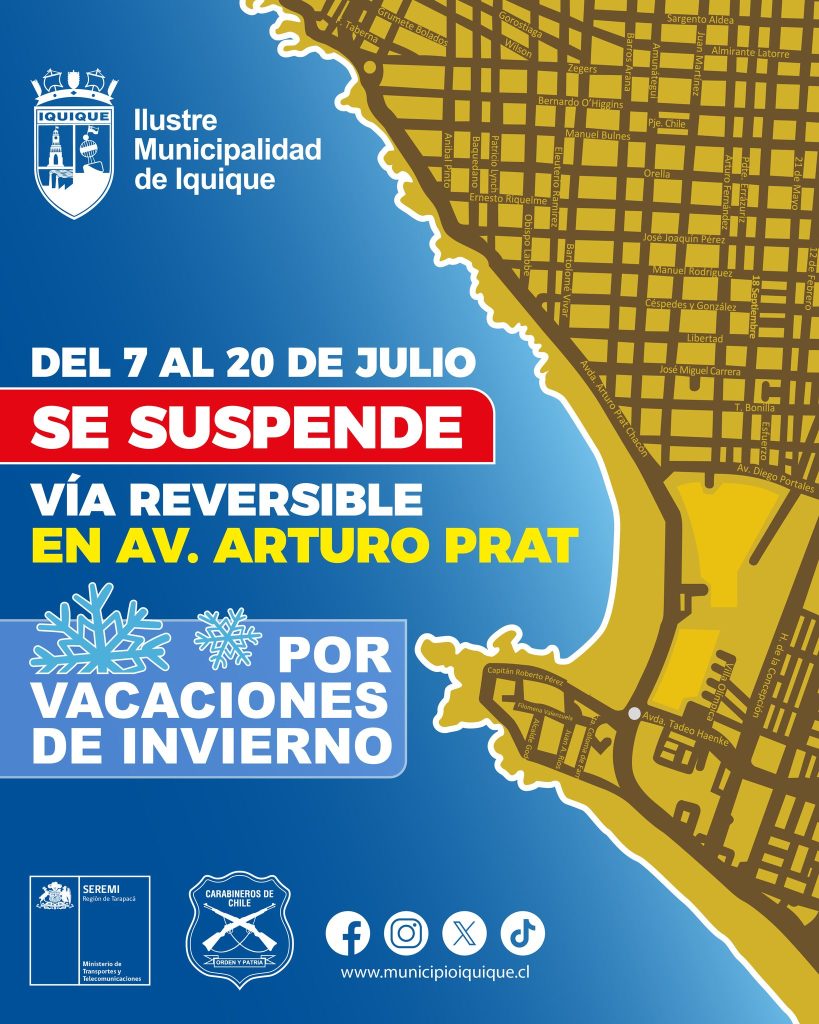 “Carabineros de la Prefectura Iquique informan los vecinos de la comuna que a consecuencia de las vacaciones de invierno de nuestros estudiantes que se ha suspendido la reversibilidad de avenida Arturo Prat, es decir, esta avenida tendrá tránsito bidireccional las 24 horas del día durante el tiempo en que nuestros estudiantes se encuentren de vacaciones y posteriormente ello volverá a la habitualidad en que sólo tiene tránsito hacia el norte durante la mañana”, explicó.