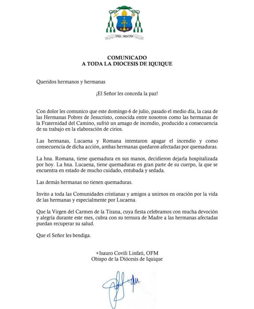 Por último, desde la Diócesis de Iquique invitaron “a toda las Comunidades cristianas y amigos a unirnos en oración por la vida de las hermanas y especialmente por Lucaena”.