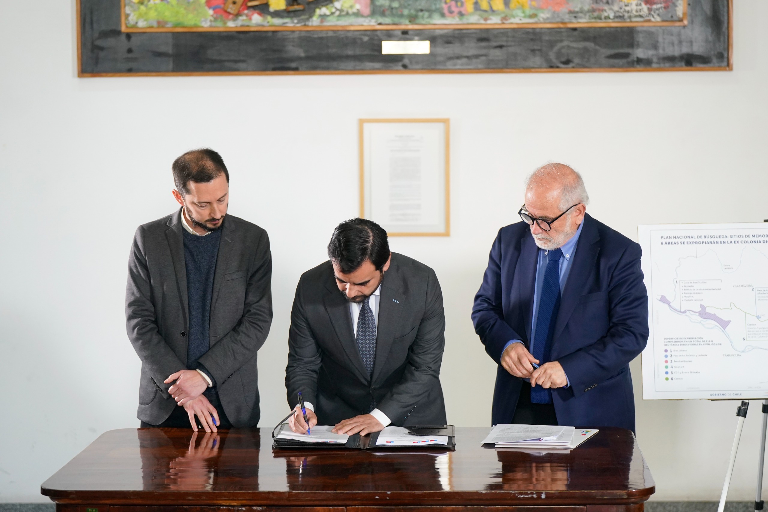 Este lunes, los ministros de Justicia y Derechos Humanos, Jaime Gajardo; de Vivienda y Urbanismo, Carlos Montes; y de Bienes Nacionales, Francisco Figueroa, firmaron el decreto de expropiación de gran parte de los terrenos que componen la ex Colonia Dignidad, dando así un paso clave hacia su transformación en un sitio de memoria.