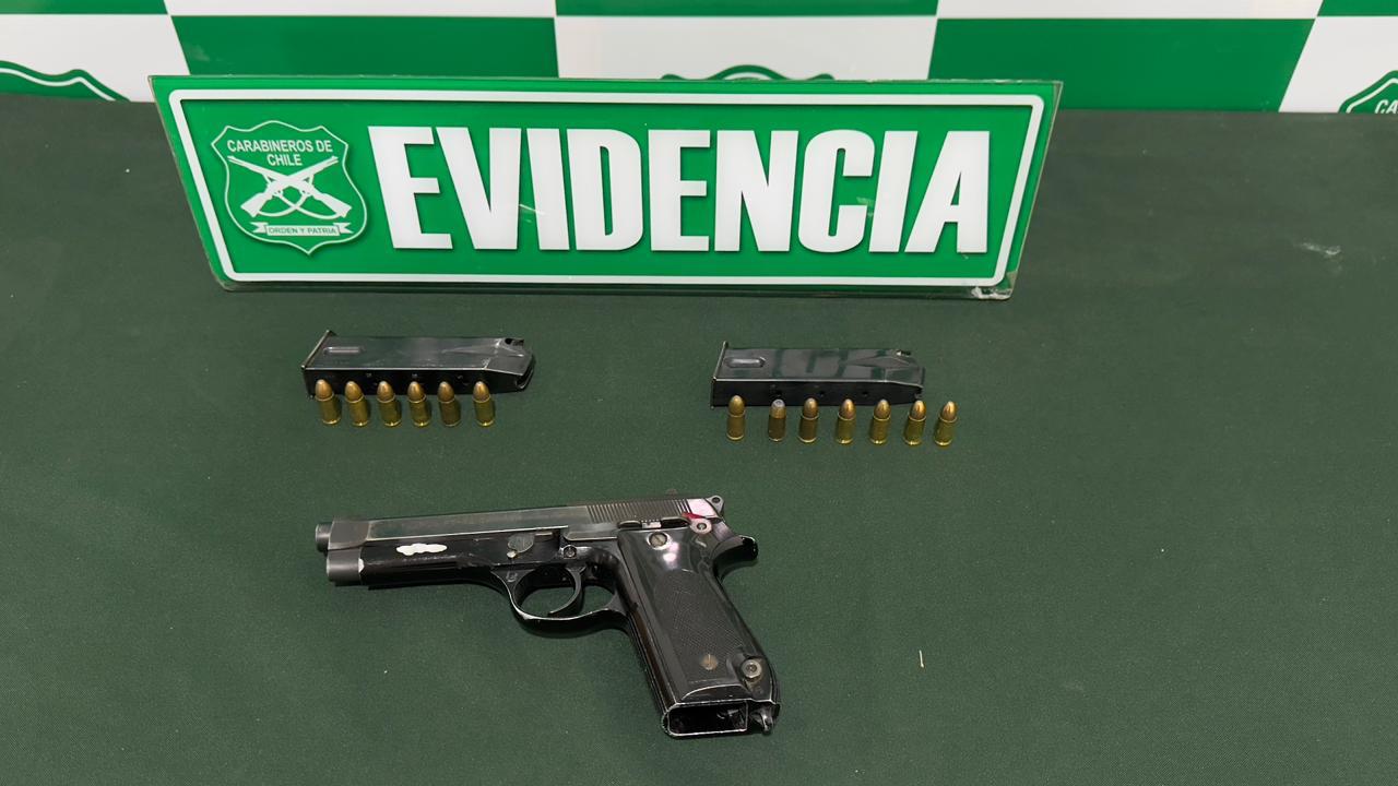 El arma incautada corresponde a una pistola marca Taurus, de 9 milímetros, la cual fue encontrada con dos cargadores, uno con siete municiones y otro con seis municiones.