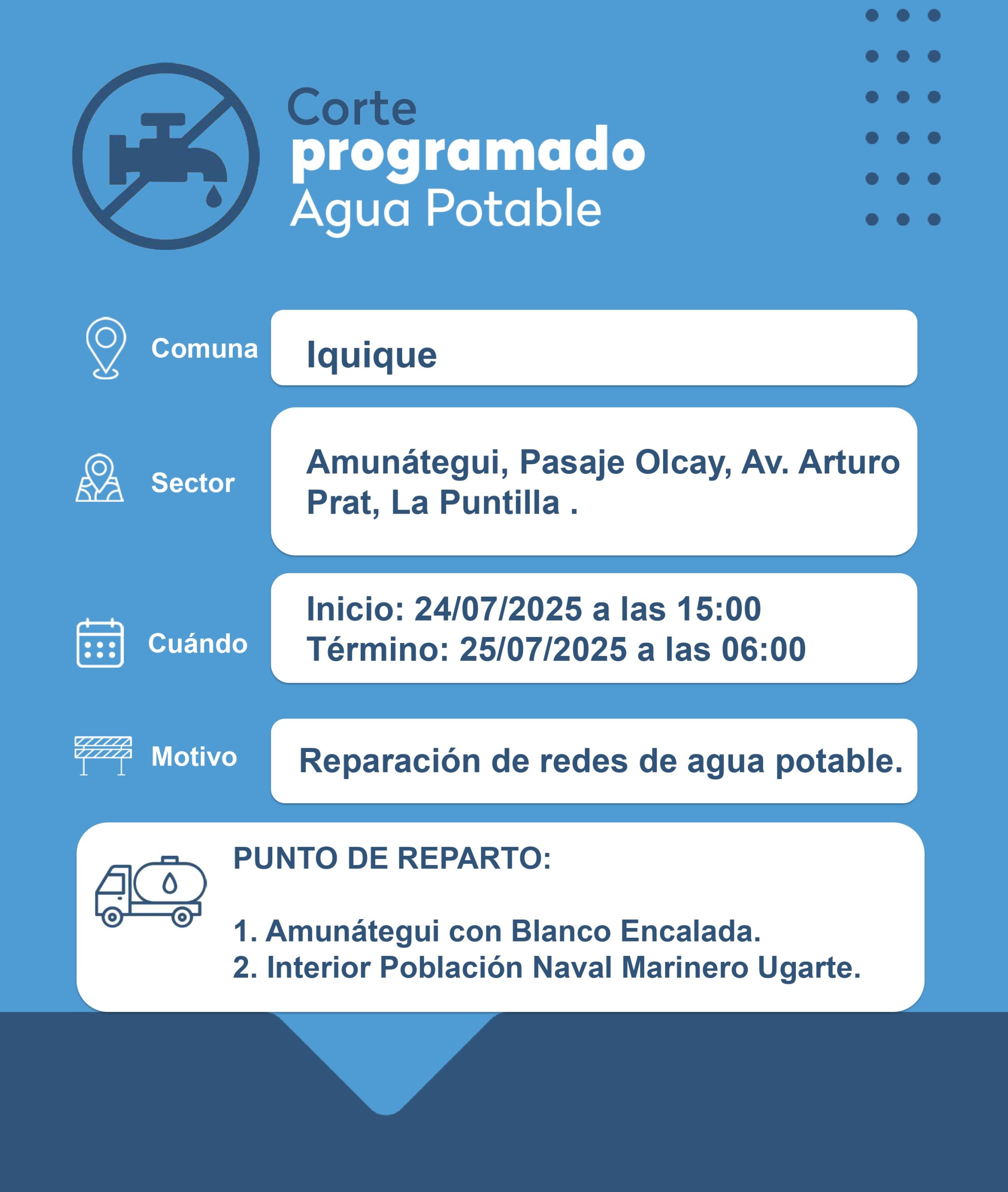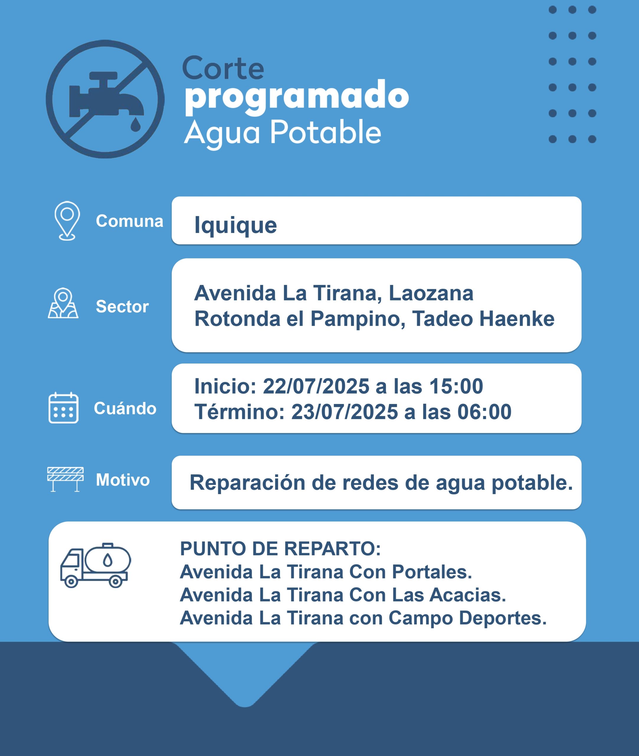 Este operativo contempla la conexión de una nueva matriz en el sector de Avenida La Tirana, Laozana, Rotonda El Pampino y Tadeo Haenke. Además, se dispondrá de tres puntos de distribución alternativos de agua potable, ubicados en Av. La Tirana con Portales, Av. La Tirana con Las Acacias y en Av. La Tirana con Campo Deportes.
