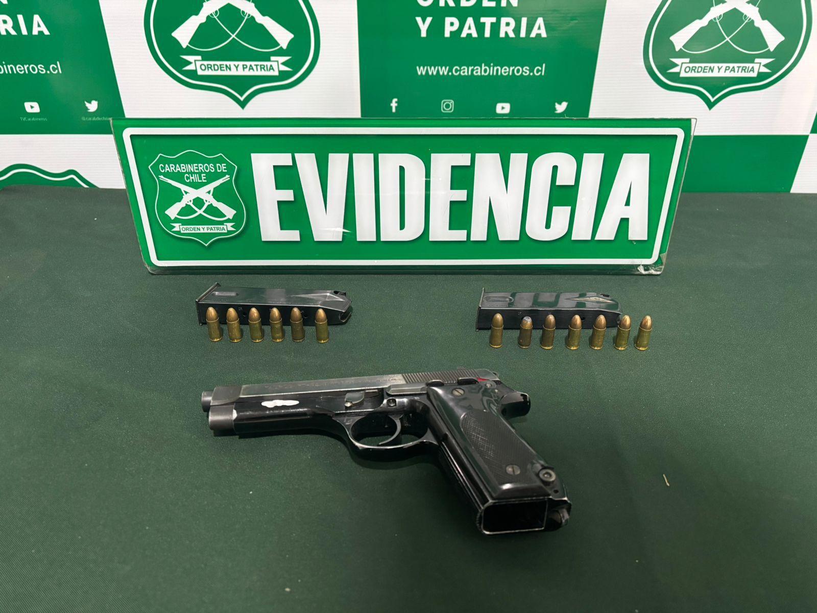 El arma incautada corresponde a una pistola con dos cargadores y municiones, la cual fue remitida al Laboratorio de Criminalística de Carabineros para ser periciada.