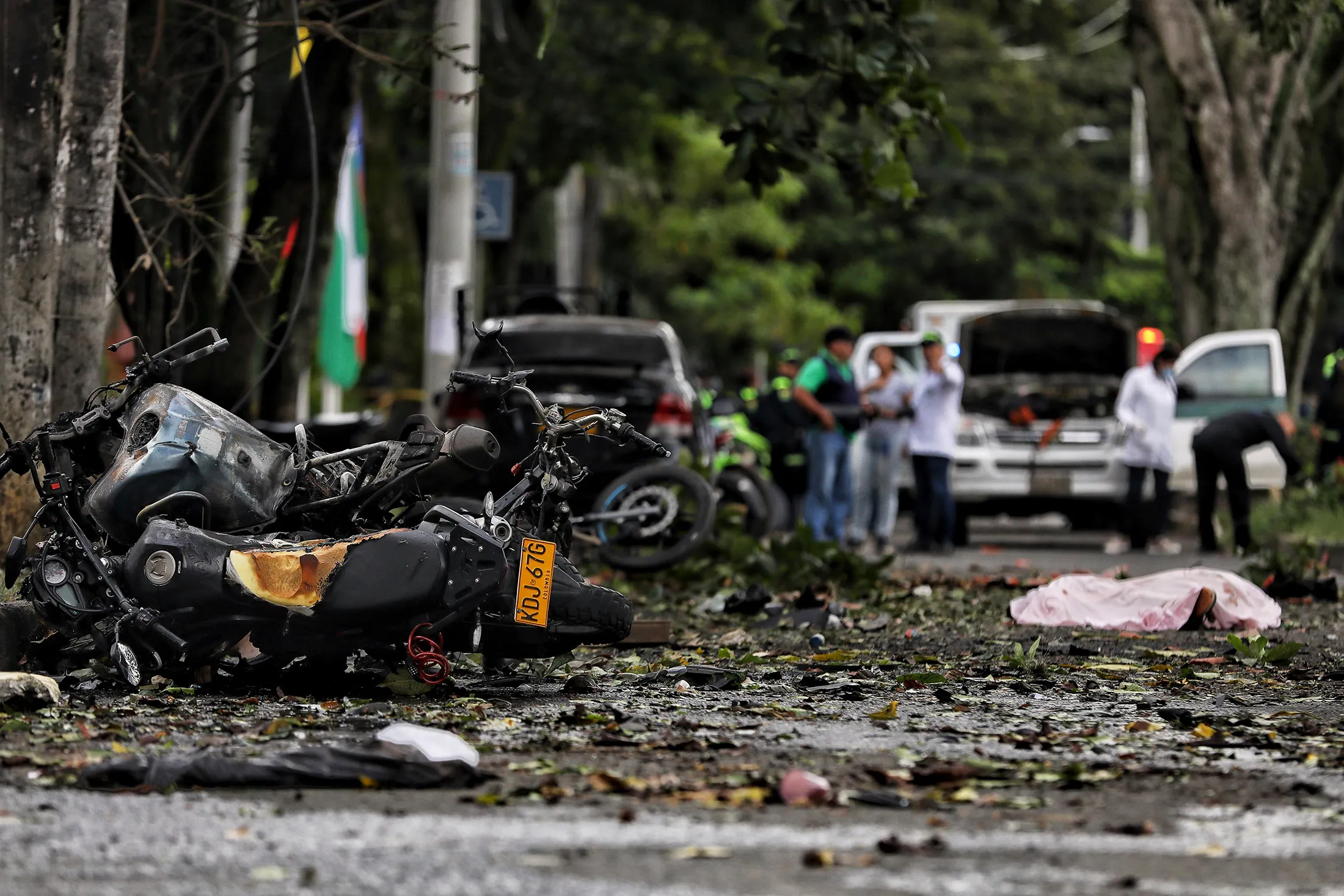 El primer atentado fue dirigido contra un helicóptero de la Policía colombiana, supuestamente con un dron, en el noroeste de Colombia, lo que dejó al menos ocho muertos y ocho heridos, según informaron las autoridades locales.
