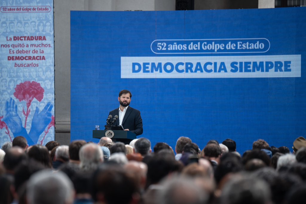 El jueves 11 de septiembre, el presidente Gabriel Boric encabezó el acto de conmemoración de los 52 años del golpe de Estado en Chile junto a agrupaciones de derechos humanos y de la sociedad civil, autoridades de Gobierno y de Estado en el Palacio de La Moneda.
