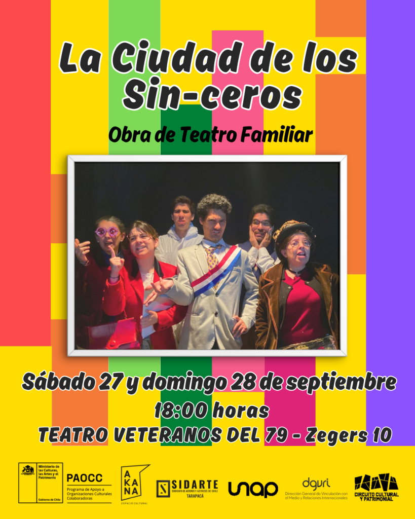 Este sábado 27 y domingo 28 de septiembre a las 18:00 horas, el público iquiqueño podrá disfrutar de la obra familiar “La Ciudad de los Sin-Ceros”, presentada en el Teatro Veteranos del 79, en el marco del Encuentro Familiar Pichintún – 15 años de Espacio Akana.