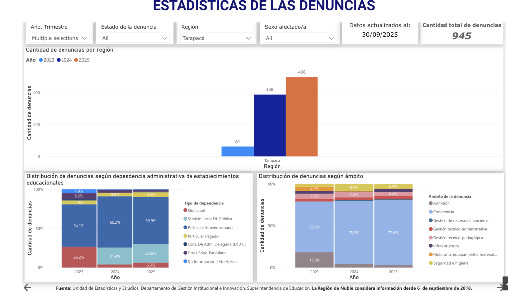 La Superintendencia de Educación registró un aumento de denuncias en la región de Tarapacá durante 2025, alcanzando 496 casos hasta el 30 de septiembre, cifra que supera los 388 reportes de 2024 y los 61 de 2023, según las estadísticas oficiales del organismo.