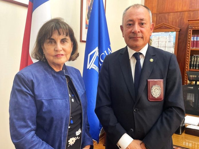 La presidenta de la Corte de Apelaciones de Arica, María Verónica Quiroz Fuenzalida, recibió durante el martes 14 de octubre el saludo protocolar del jefe regional de la Policía de Investigaciones José Contreras Hernández, quien asumió su cargo hace unos días.