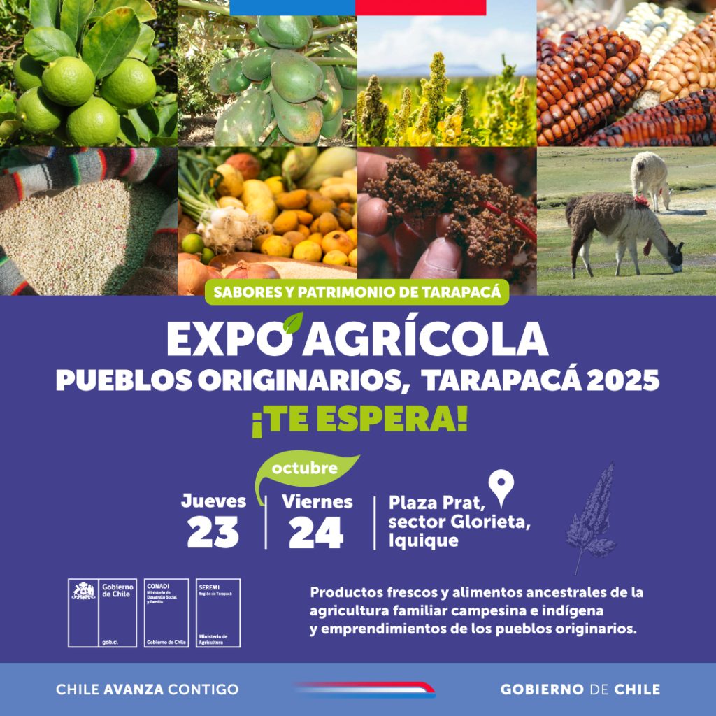 Agricultores, agricultoras y proveedores locales del rubro silvoagropecuario de las cinco comunas del Tamarugal se darán cita este jueves 23 y viernes 24 de octubre en la Plaza Prat de Iquique, sector Glorieta, en el marco de la Expo Agrícola Pueblos Originarios Tarapacá 2025, organizada por la Corporación Nacional de Desarrollo Indígena (Conadi) y la Seremi de Agricultura.