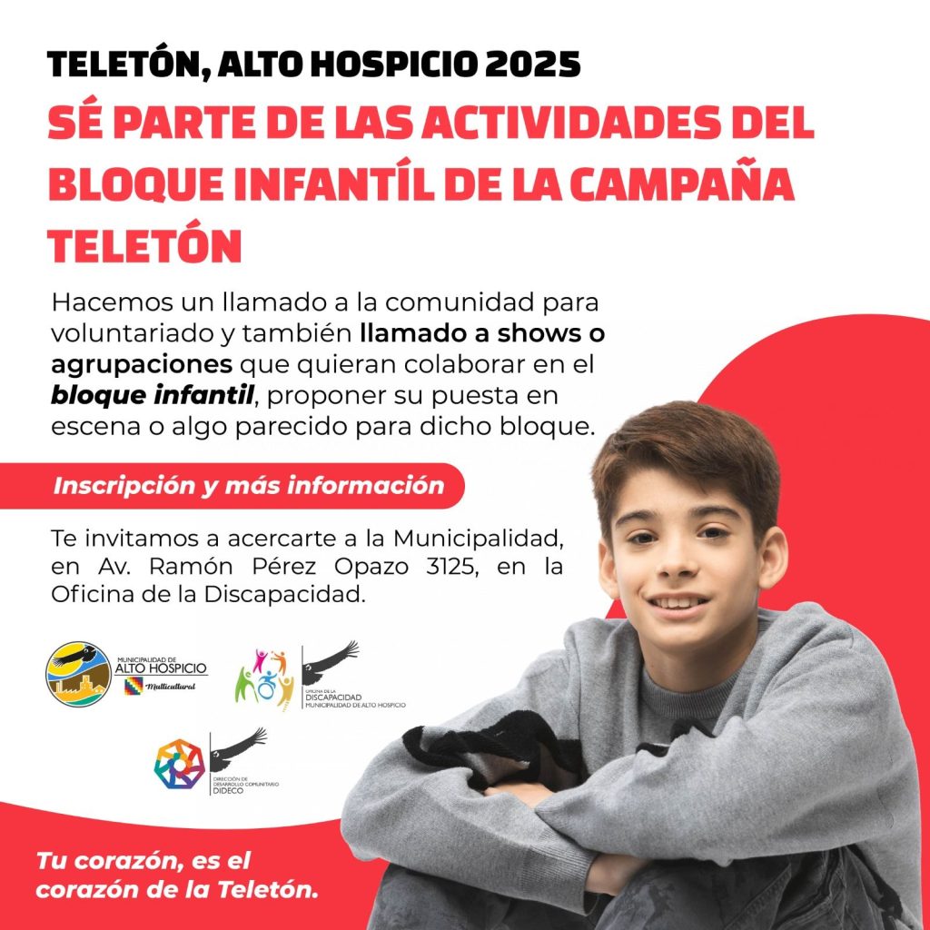 La Municipalidad de Alto Hospicio hace un llamado a vecinos, agrupaciones y voluntarios que deseen colaborar en la campaña Teletón 2025, especialmente en el bloque infantil, aportando con shows, presentaciones o actividades recreativas.