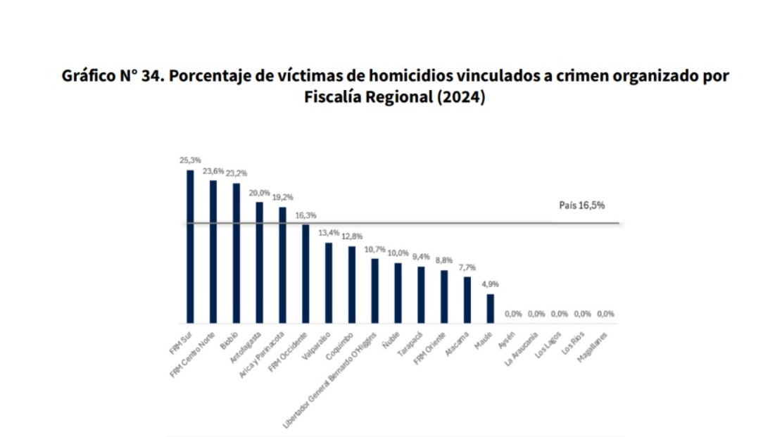 En 2024 el 16,5% de los homicidios en Chile estuvo vinculado a dinámicas de crimen organizado y la proporción varía considerablemente por región.