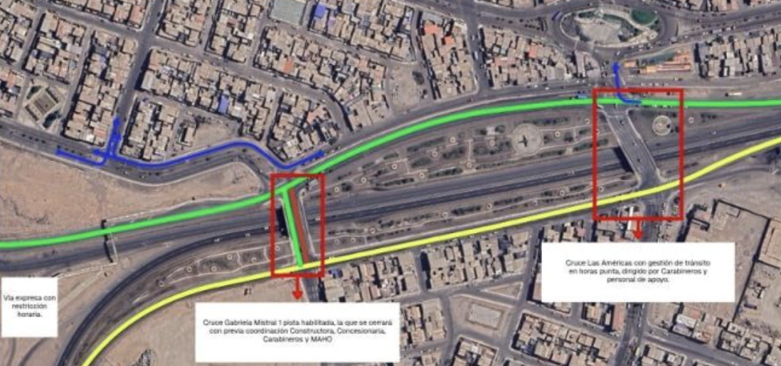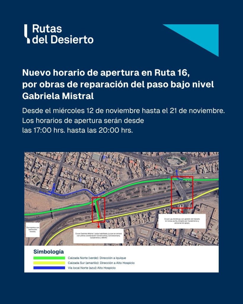 La concesionaria Rutas del Desierto informó un nuevo horario de apertura en la Ruta 16, debido a las obras de reparación del paso bajo nivel Gabriela Mistral, en el acceso a Alto Hospicio.
