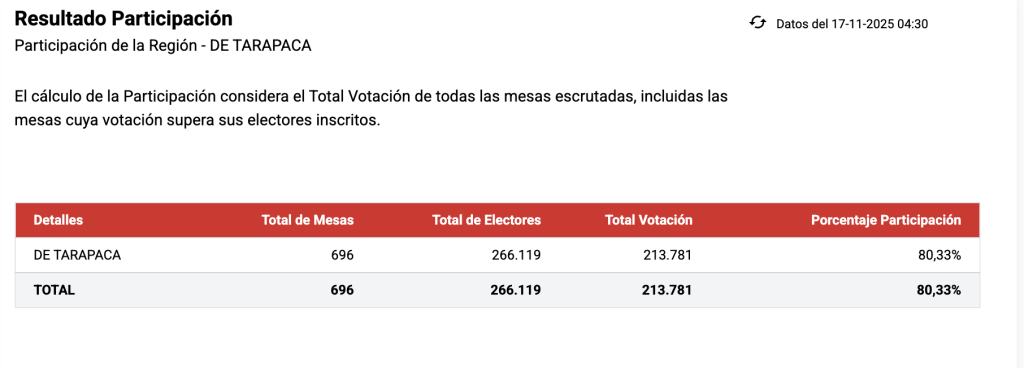 La Región de Tarapacá registró una participación electoral del 80,33%, según los datos actualizados al 17 de noviembre a las 04:30 horas. La cifra corresponde al total de sufragios emitidos en las 696 mesas escrutadas en toda la región.