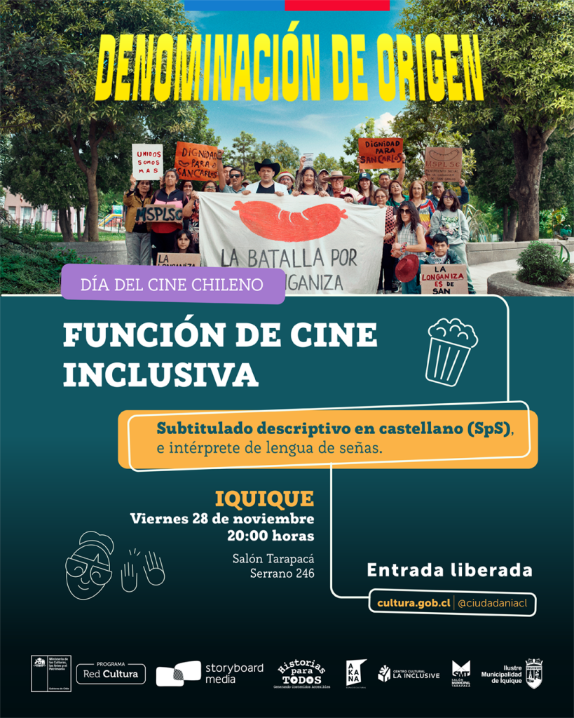 En el marco del Día del Cine Chileno, este viernes 28 de noviembre, a las 20:00 horas, se exhibirá la película “Denominación de Origen” en el Salón Municipal Tarapacá (Serrano 246). La actividad es gratuita y abierta a toda la comunidad.