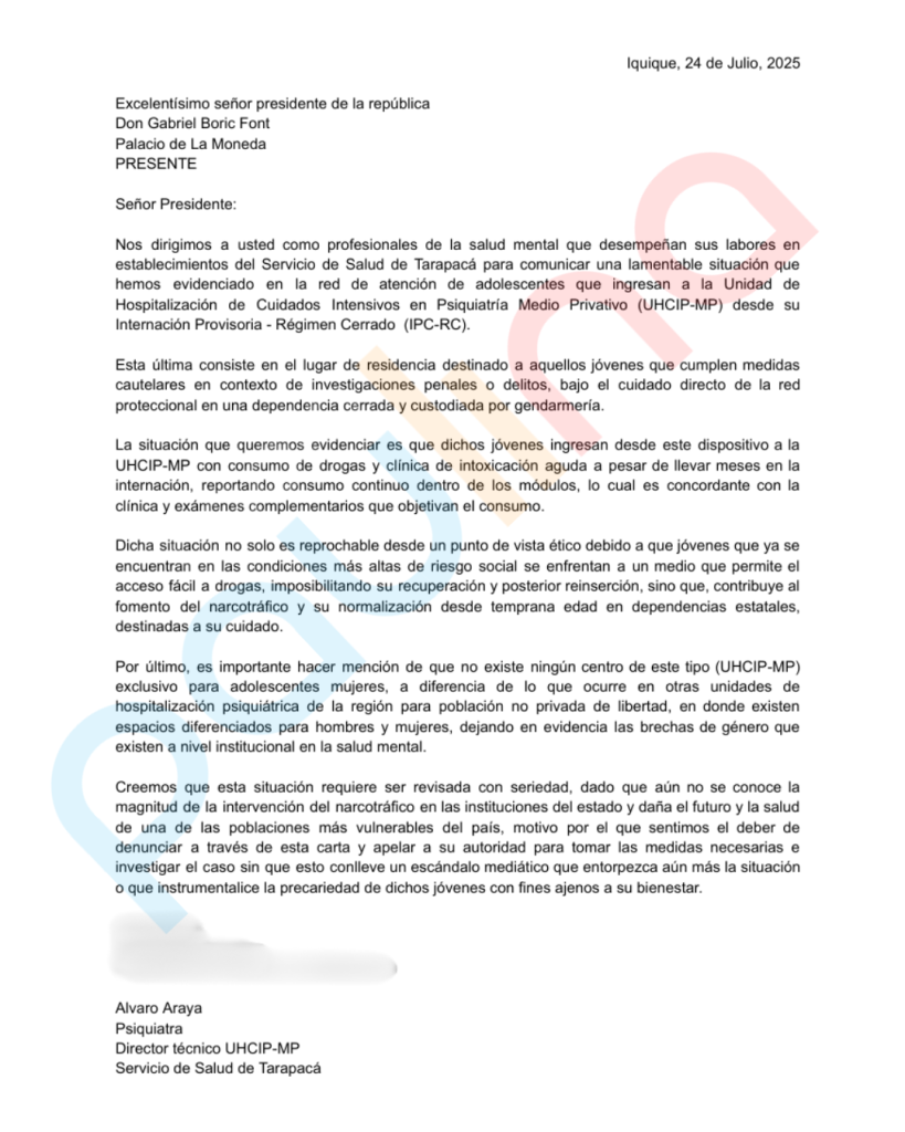 Tras evidenciar esta situación y no obtener una respuesta satisfactoria del Departamento de Salud Mental del Servicio de Salud Tarapacá, Araya decidió enviar, junto a una colega, una carta al presidente Gabriel Boric denunciando estos hechos que afectan a menores de edad.