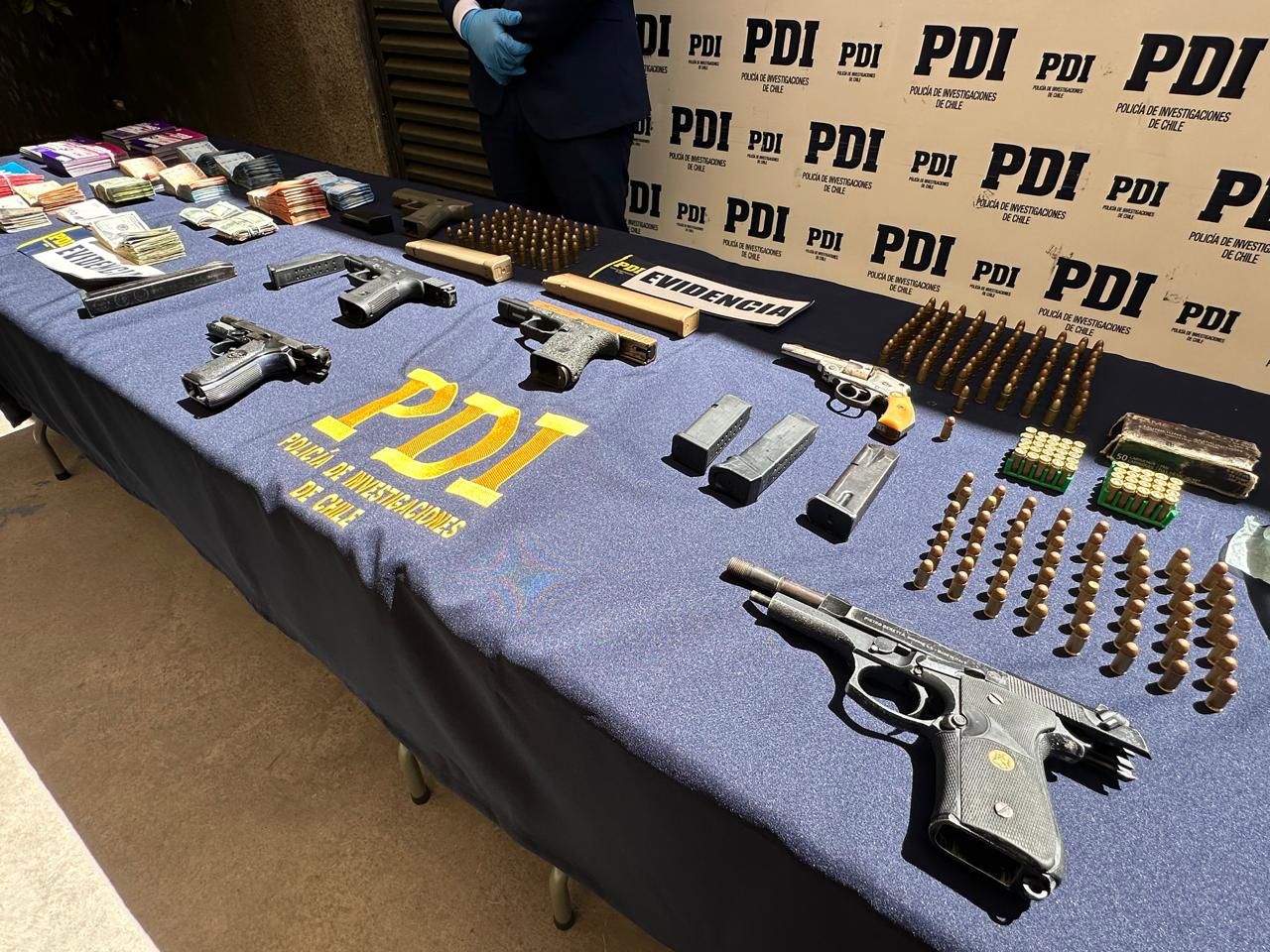 En el marco de este trabajo investigativo, el 30 de agosto de 2024, detectives allanaron el domicilio del acusado, ubicada en calle Juan Antonio Ríos, donde se halló 5 armas de fuego, cargadores y diversa munición, una granada de mano, y casi 2,5 kilos de distintas drogas.