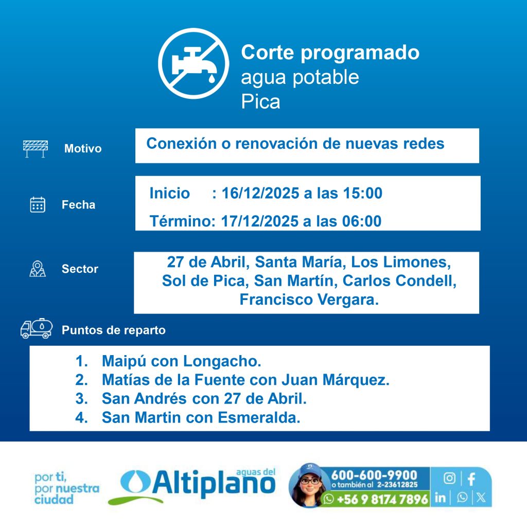 Con el objetivo de fortalecer el servicio en la comuna, la empresa Aguas del Altiplano realizará un corte programado de agua potable en la comuna de Pica.