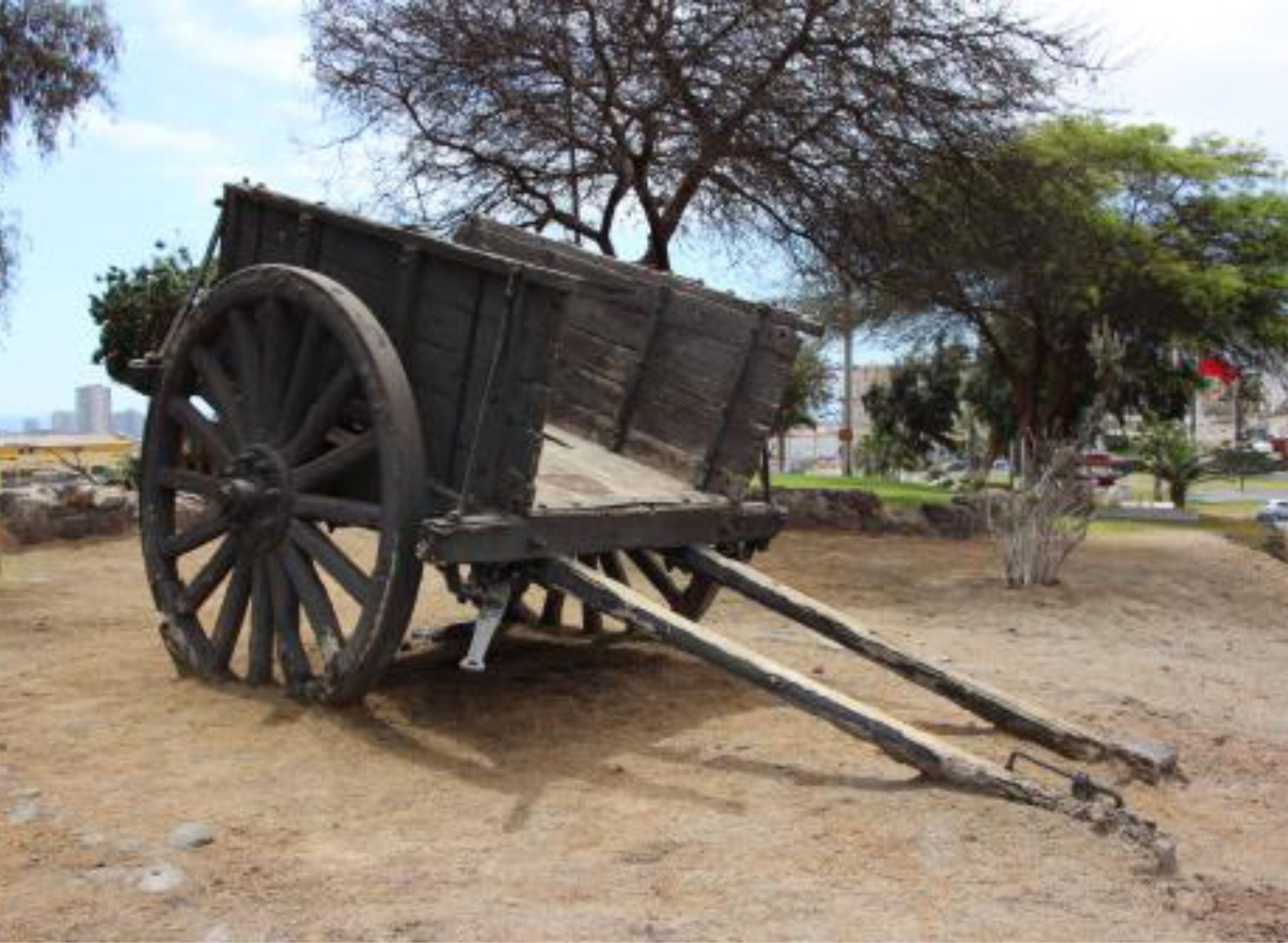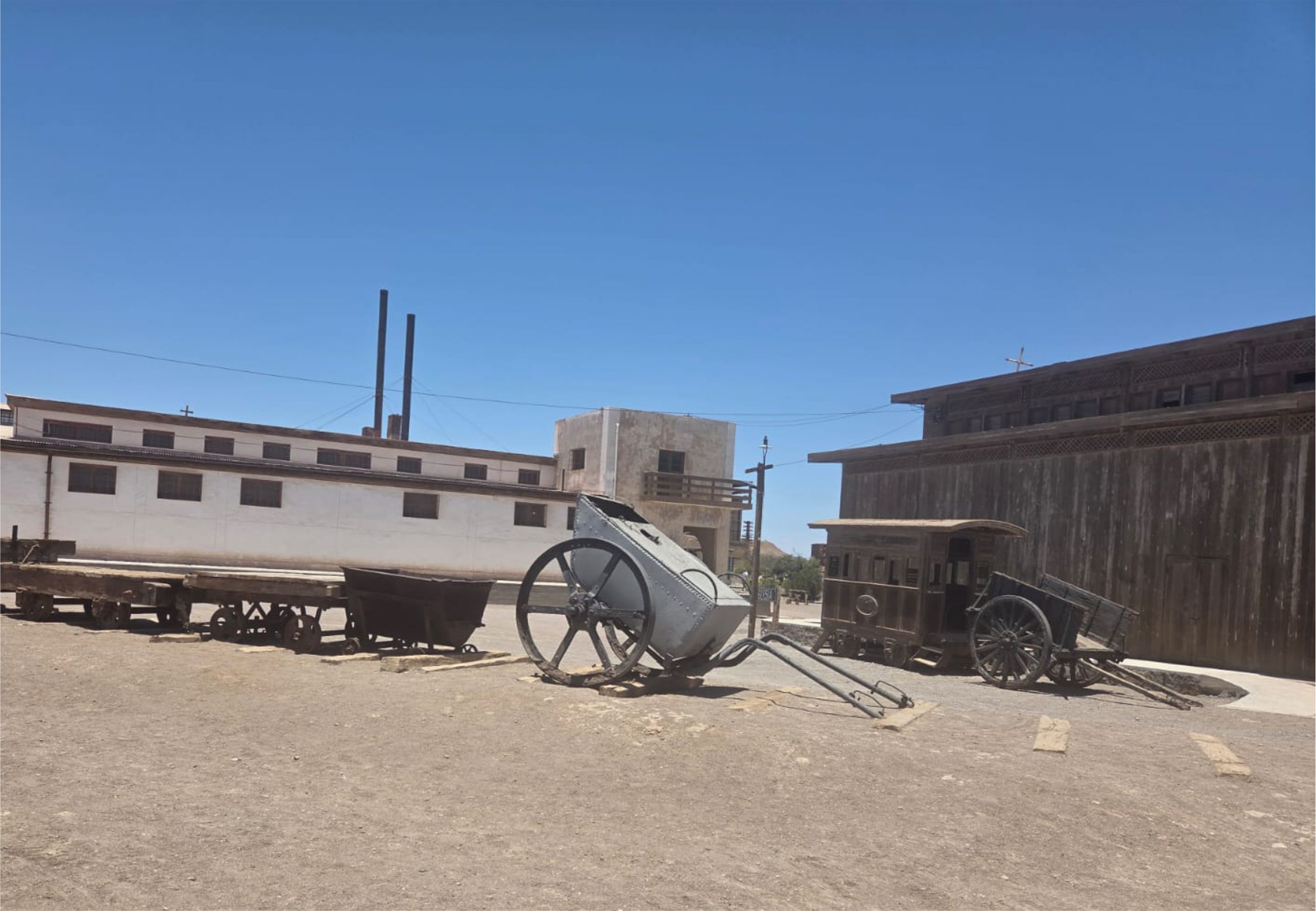 1.- Carreta de Carga de Caliche: La pieza es original y construida en madera con estructura de metal. Antes de su retiro, presentaba sus ruedas enterradas en la tierra, sin base de posicionamiento que le permitiera un anclaje seguro al terreno.
