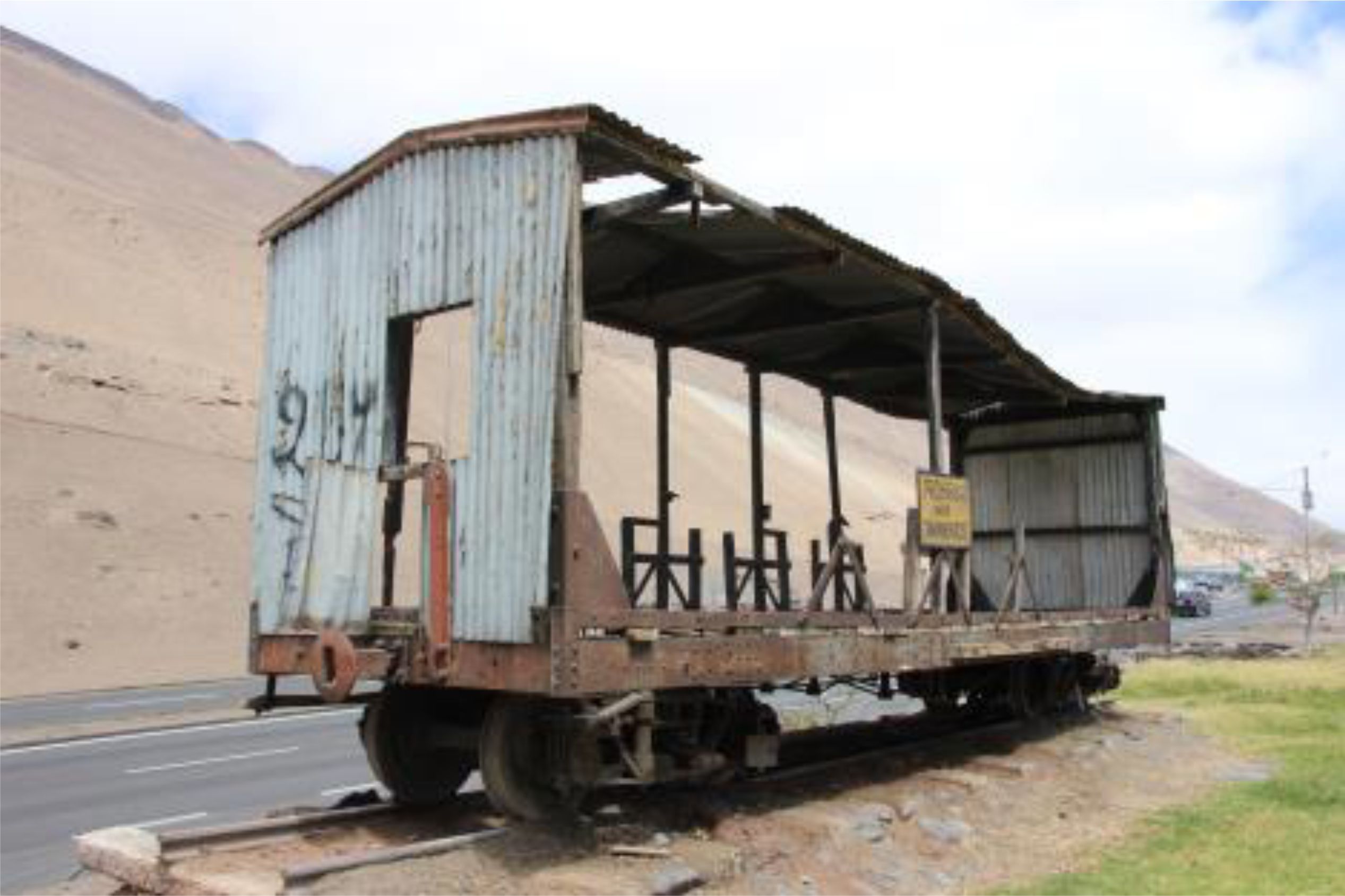 El Vagón consta de techo y paredes de calaminas, encontrándose posicionado en rieles de metal. La totalidad de la estructura de metal presenta oxidación por exposición al ambiente de humedad y salinidad. La parte posterior del vagón de metal esta intervenido por grafitis, como se indica en la ficha técnica.