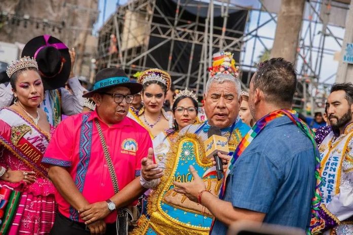 Por su parte, el alcalde de Arica, Orlando Vargas, fue parte del enlace vestido como virrey de la Morenada San Pedro de Totora, luciendo un traje que alcanza cerca de 70 kilos. El jefe comunal destacó su relación con esta festividad, señalando que lleva nueve años participando como bailarín.
