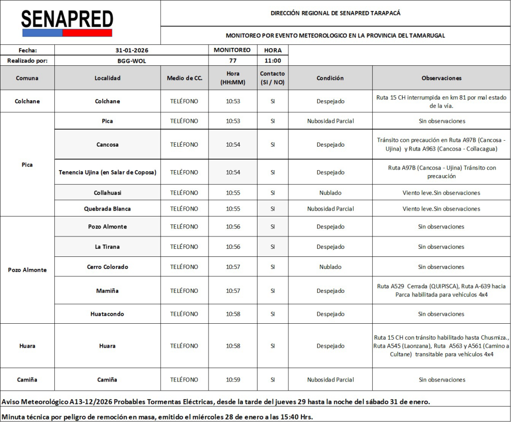 La Dirección Regional de SENAPRED Tarapacá informó este sábado 31 de enero, a las 11:00 horas, el estado de las comunas de la provincia del Tamarugal en el marco del monitoreo por evento meteorológico.