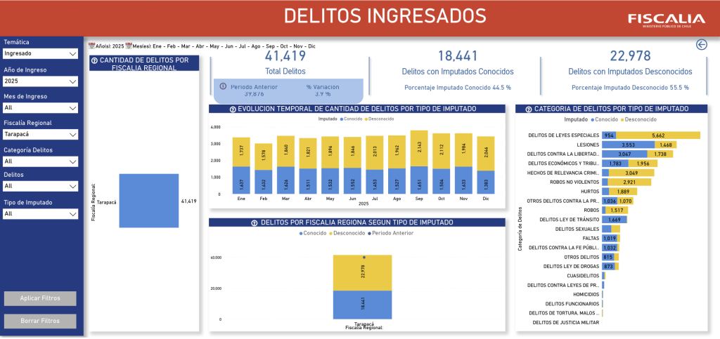 Un total de 41.419 delitos fueron ingresados durante el año 2025 en la Fiscalía Regional de Tarapacá, cifra que representa un aumento del 3,9% en comparación con el período anterior, según estadísticas oficiales del Ministerio Público. Sin embargo, uno de los datos más relevantes del balance es que más de la mitad de estos delitos —el 55,5%— ingresó sin imputados identificados.