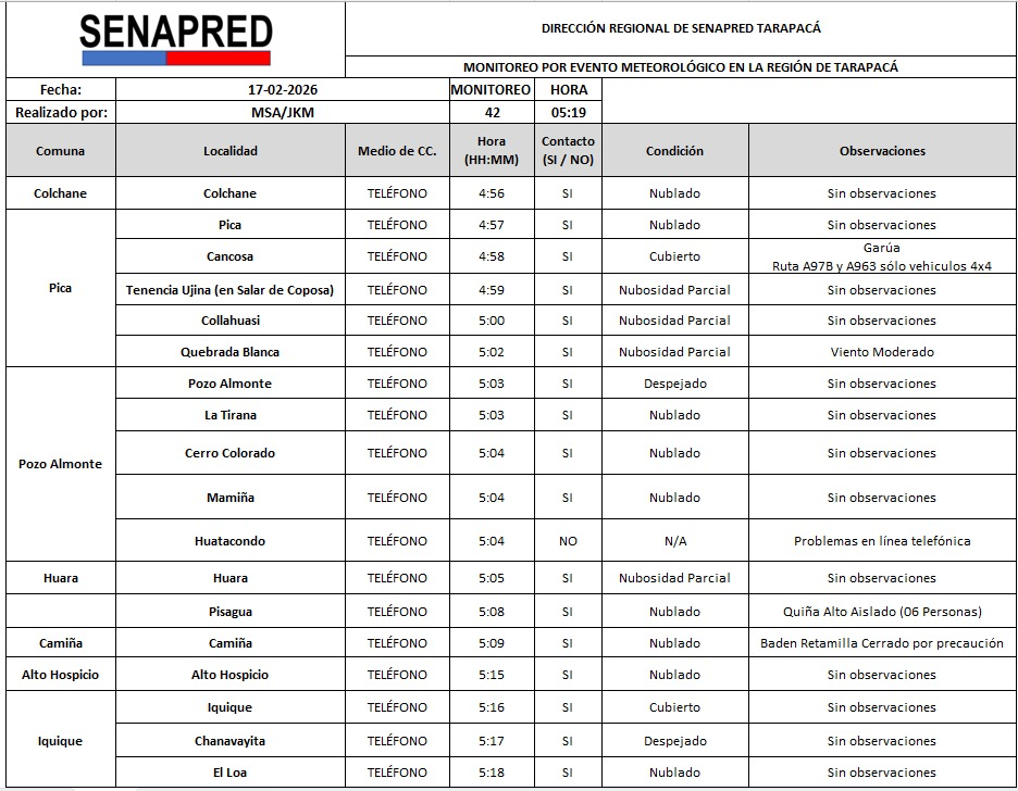 El reporte, efectuado a las 05:19 horas del 17 de febrero, incluyó contacto telefónico con distintas localidades de las comunas de Colchane, Pica, Pozo Almonte, Huara, Camiña, Alto Hospicio e Iquique, constatándose en su mayoría condiciones de nubosidad parcial a nublado, sin afectación relevante a personas o infraestructura.