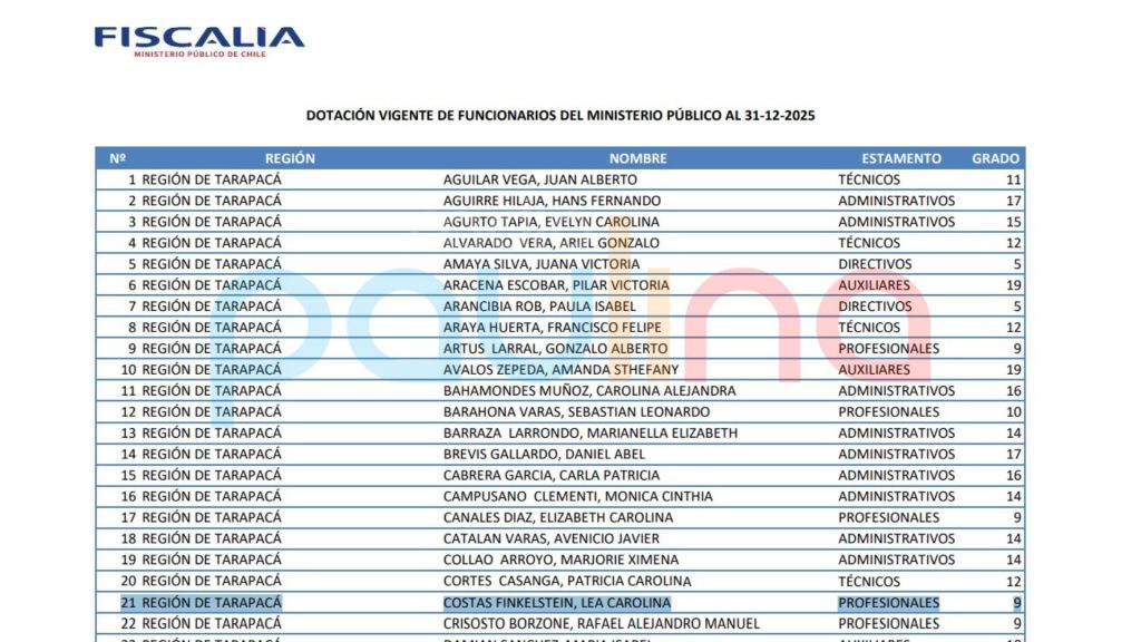 Según se detalla en el portal de Transparencia Activa del Ministerio Público, la pareja de Valenzuela figura en la dotación vigente de funcionarios con fecha del 31 de diciembre de 2025.