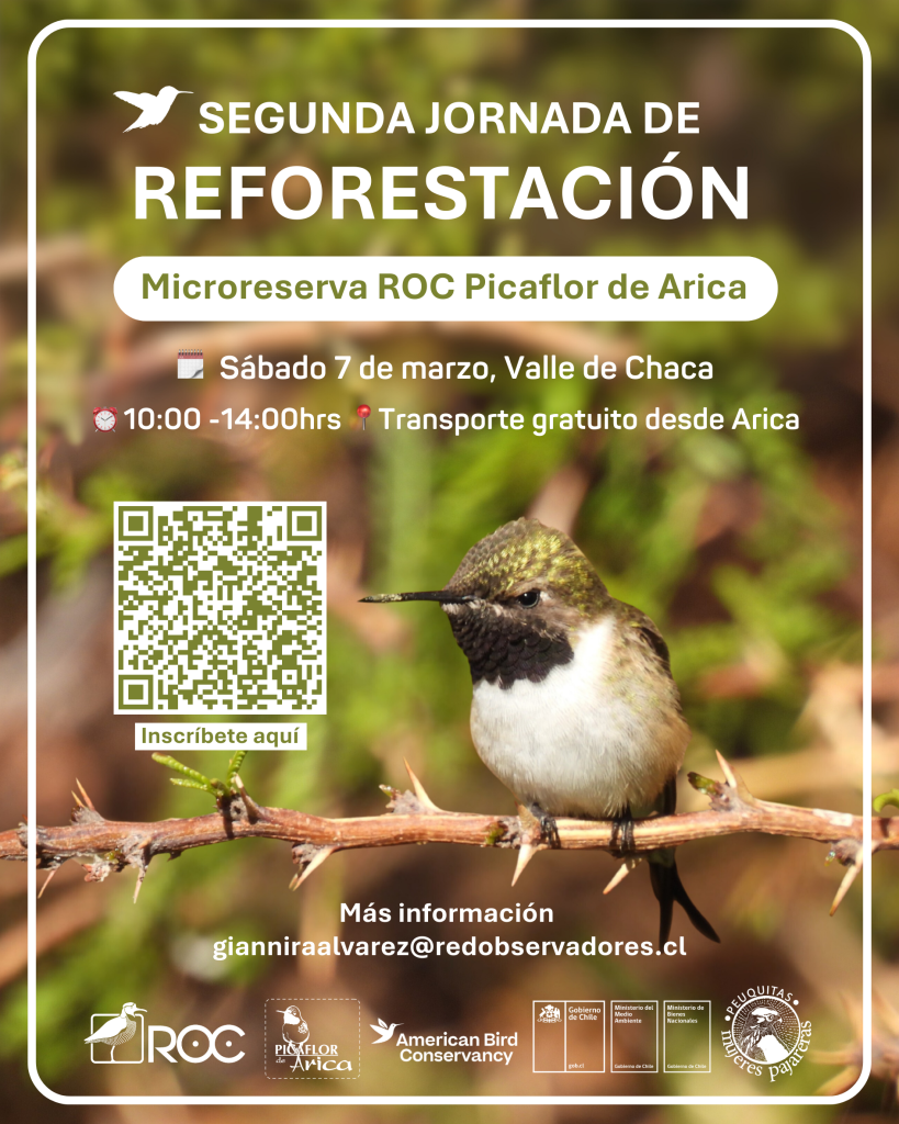 La Red de Observadores de Aves y Vida Silvestre de Chile (ROC) realizará una jornada de reforestación, con el objetivo de continuar la restauración del hábitat del picaflor de Arica (Eulidia yarrellii), especie endémica del extremo norte de Chile que se encuentra en Peligro Crítico (CR) de extinción según el Reglamento de Clasificación de Especies (RCE).