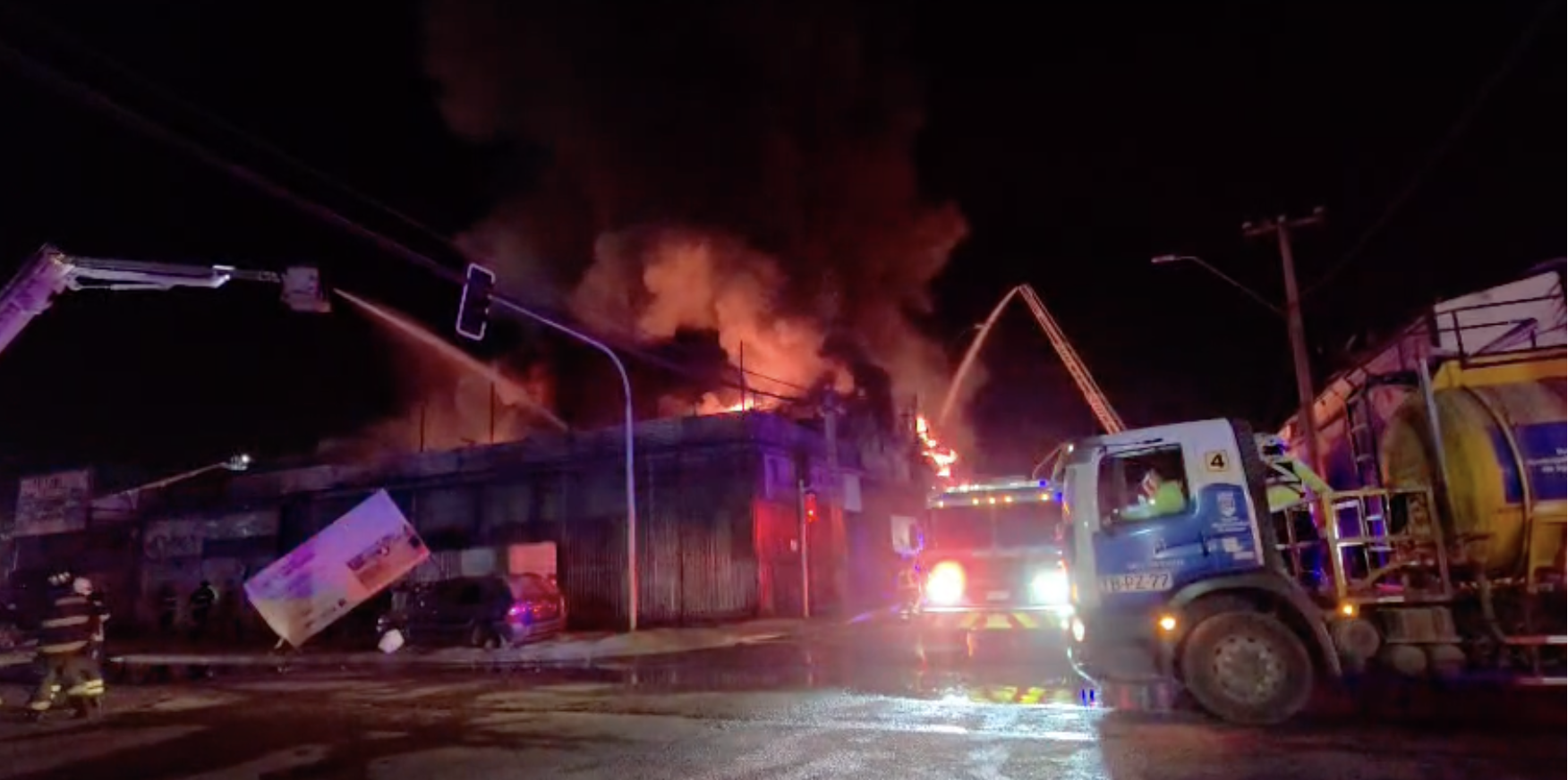 Durante el desarrollo de la emergencia se escucharon diversas explosiones, las que —según explicó— se deben al material combustible almacenado al interior de los galpones y vehículos.